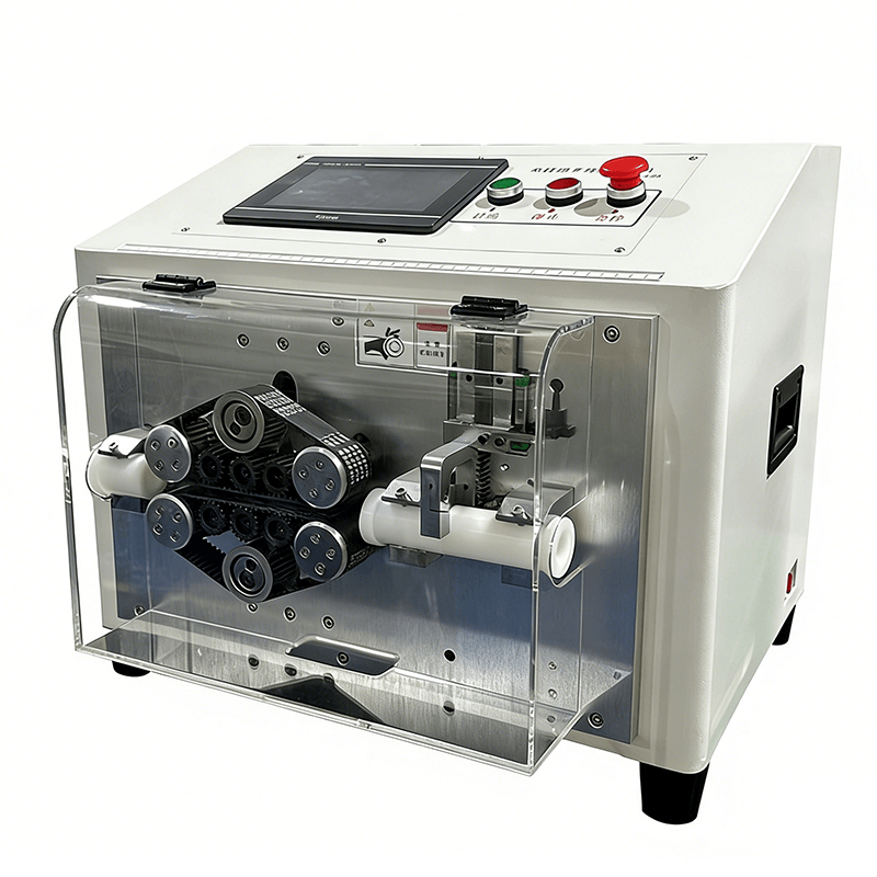 AC-325 full auto tube cutter with 7" touchscreen, 0.01mm precision, 10-roller feeding, 7000 cuts/h, safe for automotive harness/fuel lines & PVC/silicone tubes.