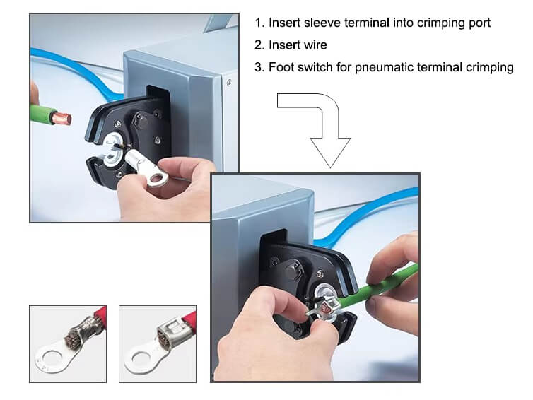 Interchangeable Die Design-Allows for crimping various terminal types.Foot Pedal Control-Ideal for medium-volume terminal production.More Reliable, Stable, and Efficient than manual crimping tools.Portable and Lightweight design for easy operation and movement.